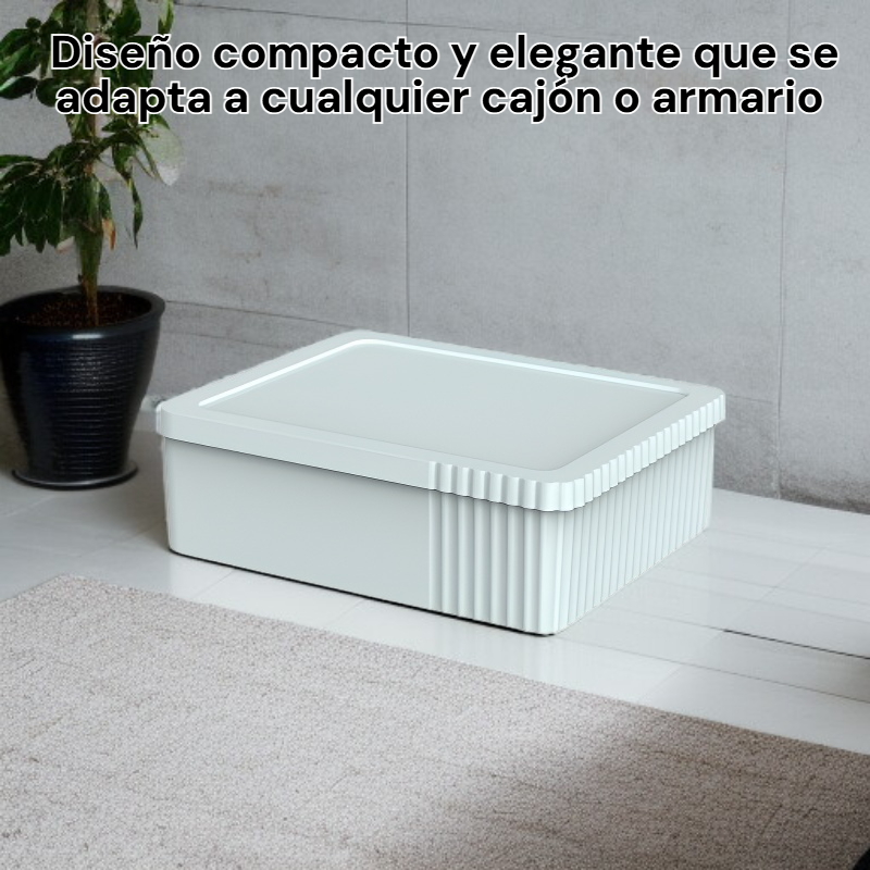 ● Organiza tus calcetines y ropa interior de manera eficiente, manteniendo cada prenda en su lugar y facilitando el acceso diario. ● Fabricada con materiales resistentes y transpirables, esta caja garantiza la protección y el cuidado de tus prendas delicadas por más tiempo. ● Diseño compacto y elegante que se adapta a cualquier cajón o armario, ahorrando espacio y mejorando el orden en tu hogar. ● Fácil de limpiar y de montar, ideal para quienes buscan practicidad y funcionalidad en la organización del guardarropa.